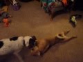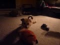 Remy sleeps outside of a crate at night with no issues. In the morning, she is so happy to see everyone, eat breakfast, and play-wrestle with the resident dog, you can't help but smile back at her! She loves playing with toys, flipping them up in the air, rolling around the floor with them, and playing tug or fetch. She also likes her chew things like Kongs and antlers. She seems to enjoy going to the toy basket and taking things out one at a time to play with (check out the video below). On a few occasions she has played with household items like blankets, towels, and socks - she just needs some redirection back to her toy box and she does fine. She understands "Sit" and is definitely ready and able to learn more obedience skills. She enjoys chasing the other dog in the fenced in yard, and would likely do very well at a dog park. Remy has short tan fur with some black mixed in, which seems easy to care for and sheds very little. She can often be found spread out on the floor with her back legs stretched behind her (check out the picture below), just chilling while she watches the humans make dinner or do chores. With the curl in her tail, and ears that are cocked just slightly different from each other, she has a sweet look to her that is hard to resist - just meet her in person and you'll see for yourself!